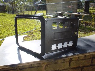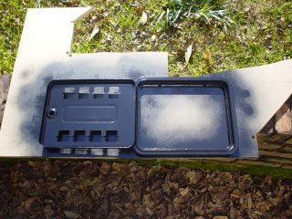 I bought some sticker remover from Wal-Mart last night and removed one decal from inside the door and removed some sticker residue that was on the outside of the door. In a perfect world, I would probably use paint stripper to remove all of the paint before I re-painted. But to be honest, I'm not that "handy" and I don't own any paint stripper. I didn't want to go buy any either because I'm afraid my two small children might get into it. So I elected (for better or worse) to just put a couple of light coats of black Rust-O-Leum on it. This is a shot of the first coat on the back of the door and around the frame.